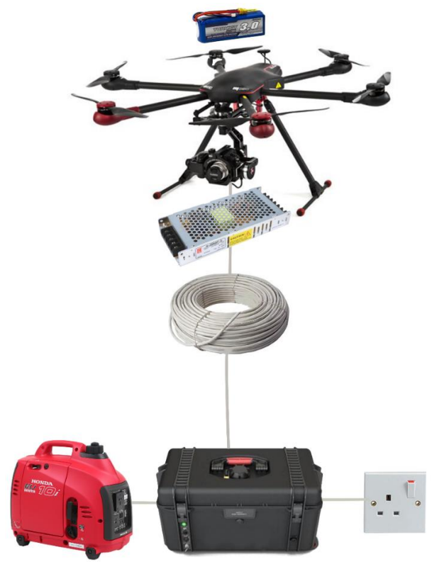 This was achieved by attaching a switch-mode power supply to the main power system of the UAV. Power was supplied through high gauge thin wires at a high voltage, allowing the current to be reduced following the conservation of power.